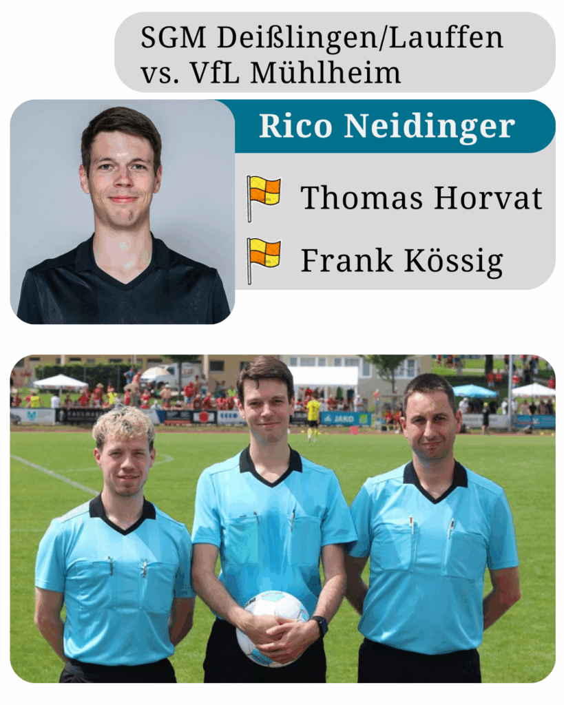 Am 13.06. leitete Rico Neidinger ein überbezirkliches Relegationsspiel zwischen der SGM Deißlingen/Lauffen und dem TSV Frommern – begleitet von seinen Assistenten Thomas Horvat und Frank Kössig.